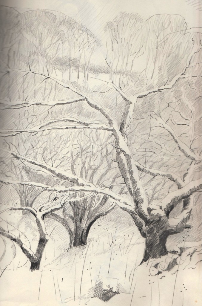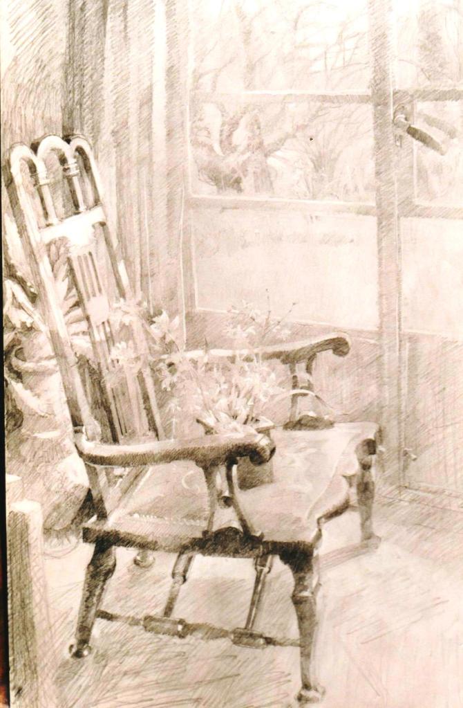 I tried to make conversation, but don’t remember what we talked about. I showed him my current sketchbook and he raised his head for a moment and there was a flicker of a smile that briefly lit up his face. Just for a moment I saw that impish grin that restored him to his old self.