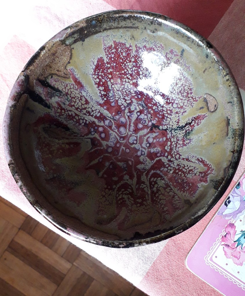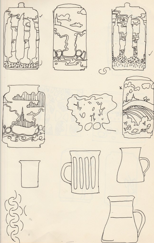 During this time I continued my practice at developing my pots trying to get up speed so that I could participate more fully in the functioning of the pottery. I felt I was developing a real bond and excitement for the pottery process. I was beginning to understand designing on a round surface and began sketching ideas for plates and functional items. This in turn was encouraging Mike to experiment more with deliberate designs rather than allowing the glazes only to create the design.